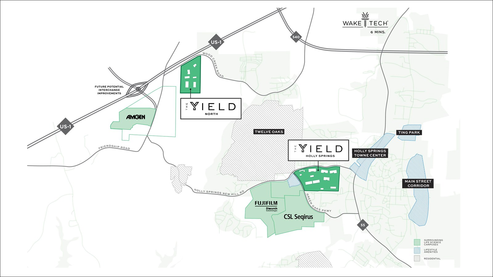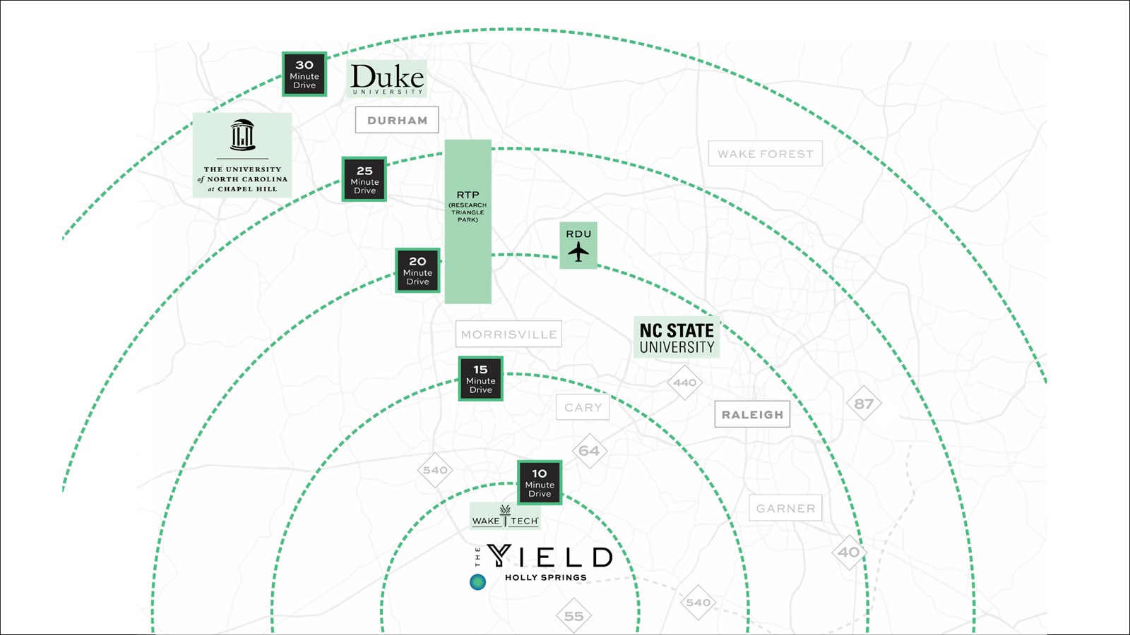 THE YIELD North by Crescent Communities is imaged to be a secure and accessible life science and innovative manufacturing campus in the core of the Triangle’s life science cluster, well-positioned to capture the Triangle Region’s best talent. In the past 20 years, Holly Springs has transformed into one of the most attractive communities in the Research Triangle region, just 30 minutes from Research Triangle Park and Raleigh-Durham International Airport via Interstate 540.